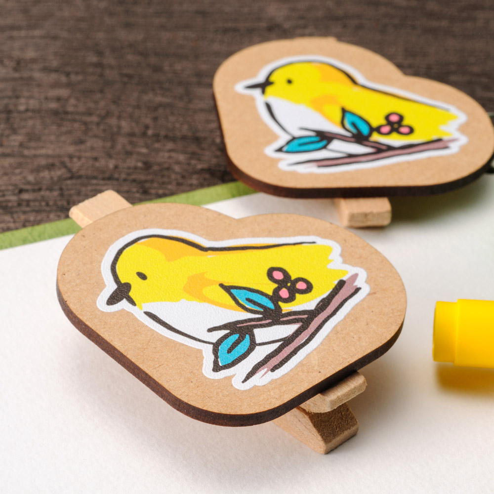 輪郭に合わせたカッティングで視認性を高めた、大きめサイズの木製クリップ。印刷部分にはインクの発色を高める白押さえを施し、ロゴやイラストを鮮明にプリント。メモを挟んだり、バッジ風に身に着けたりと、幅広い用途で楽しめます。